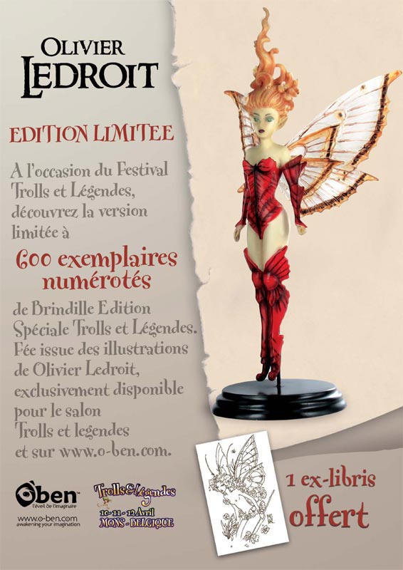 O-Ben vous fait part de la création d’une nouvelle fée issue des illustrations d’Olivier Ledroit : la fée Brindille en série limitée (600 pièces) vêtue de rouge avec un ex-libris de l’illustrateur offert, sortie à l’occasion du Salon Trolls et Légendes 2009.